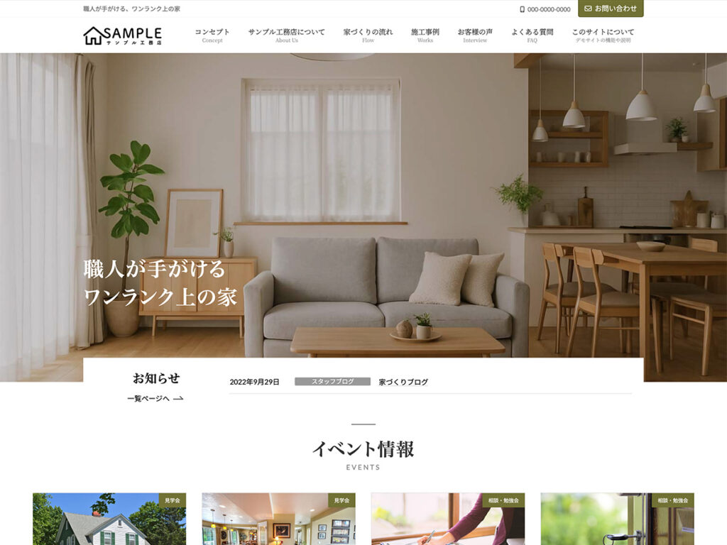 このデモサイトは、WordPress公式テーマ「Lightning」とそのPro版拡張機能「Lightning G3 Pro Unit」と、さらに「VK Blocks Pro」や「VK All in One Expansion Unit」などのプラグインを組み合わせることで、プロ品質の工務店サイトをノーコードで実現しています。シンプルで直感的な操作性と、施工実績・お問い合わせ導線など業種に特化した構成により、初心者でも安心して高機能なサイト運用が可能です。