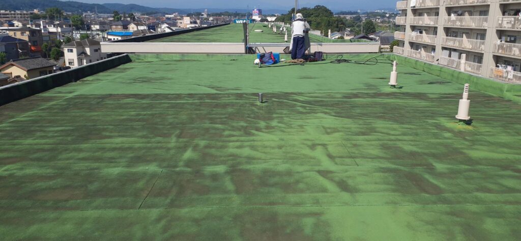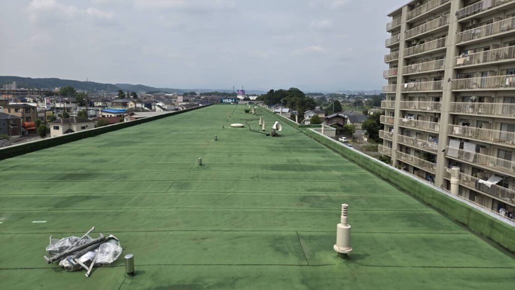 今回の現場は、当社としても比較的規模の大きな約1,500平米のマンション屋上です。