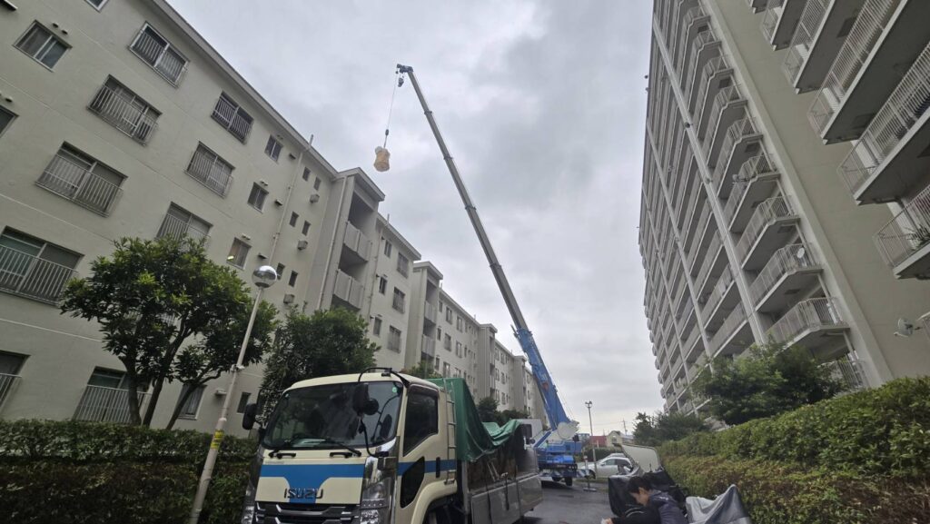 25kgの防水シート200本を人力で運ぶのは困難ですが、当社ではクレーン車などの重機を適切に活用。