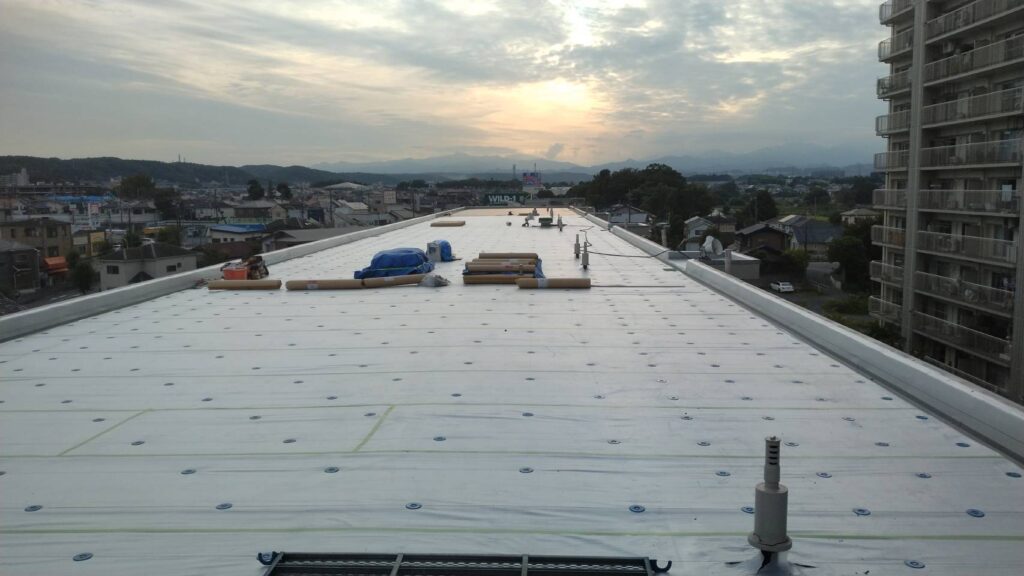 そのため、今回は軽量で耐久性の高い「塩ビシート機械固定工法」を採用。